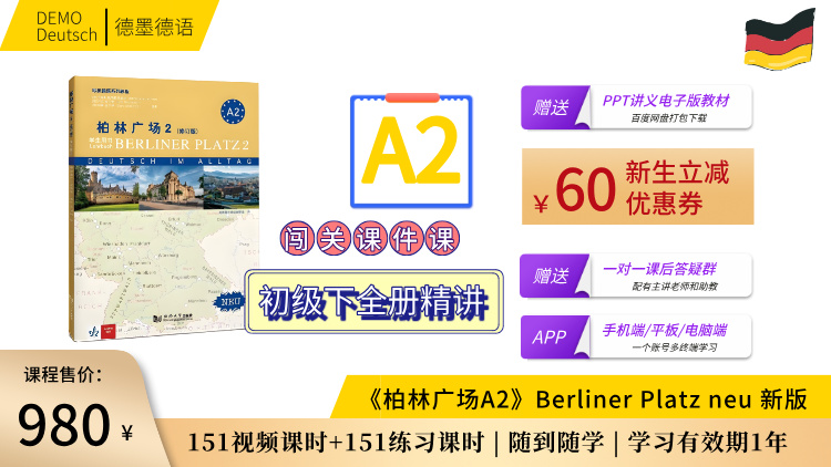 《柏林广场A2》300课时德语初级下全册精讲班【闯关课件课】1年学习有效期